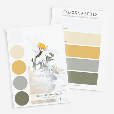 Inspired by the natural hues of the Dusty Daisy Bush (Olearia brevipedunculata), this palette includes: