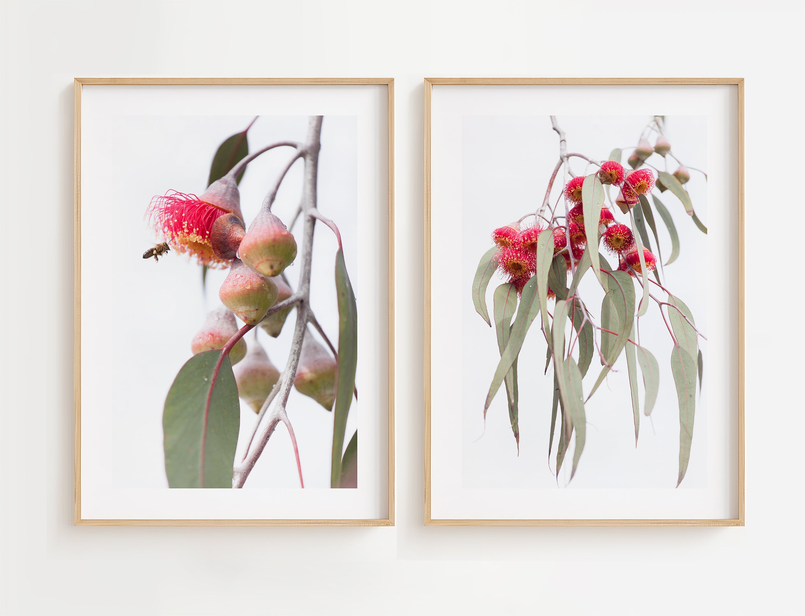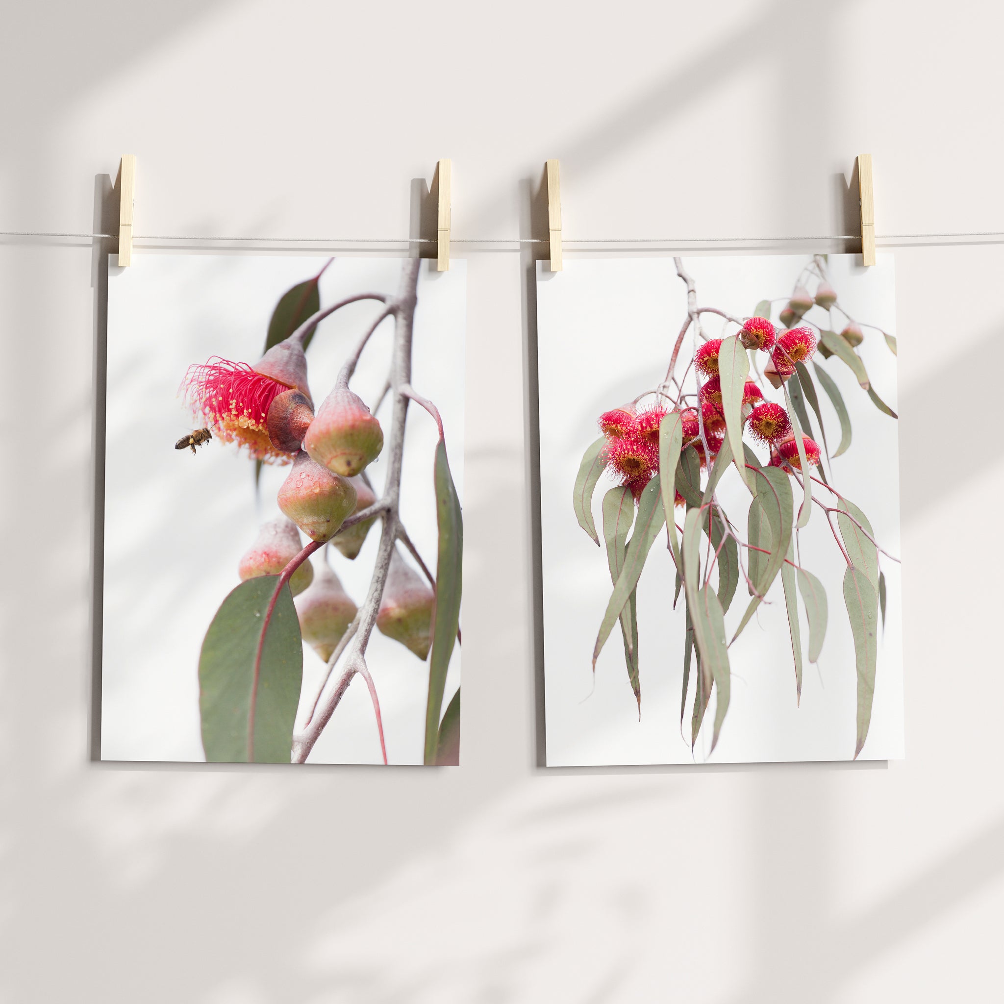 Eucalyptus caesia blossoms and bee set of 2 photography prints by Australian Flora.
