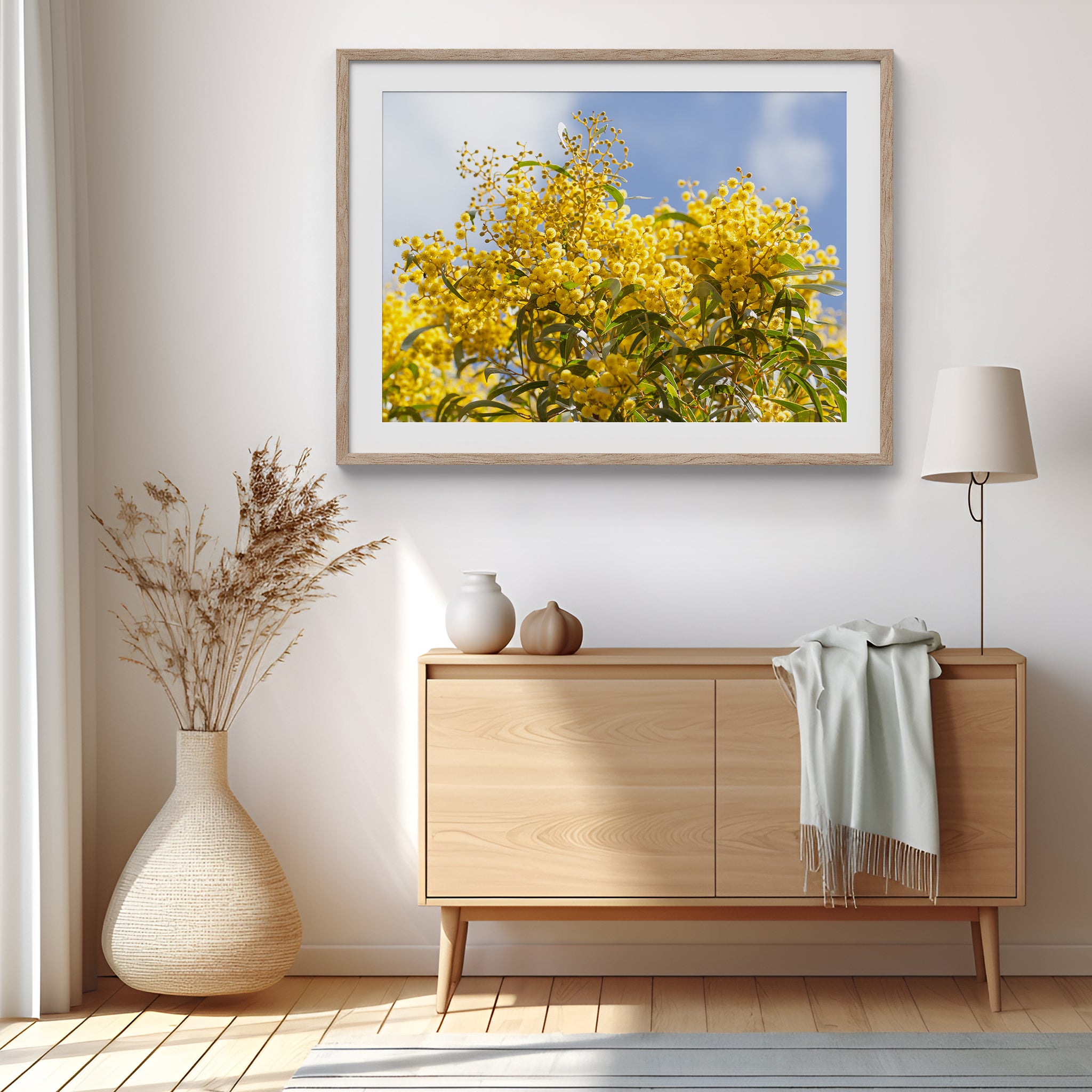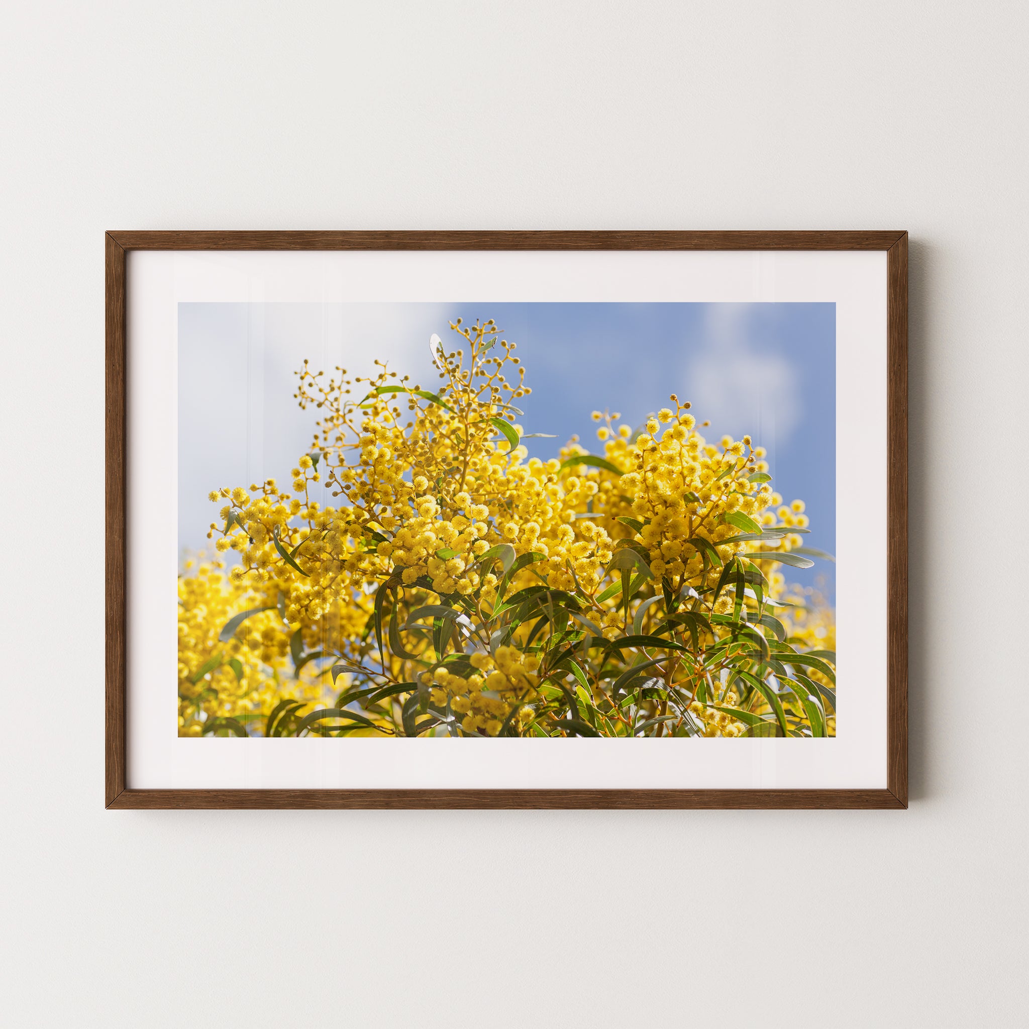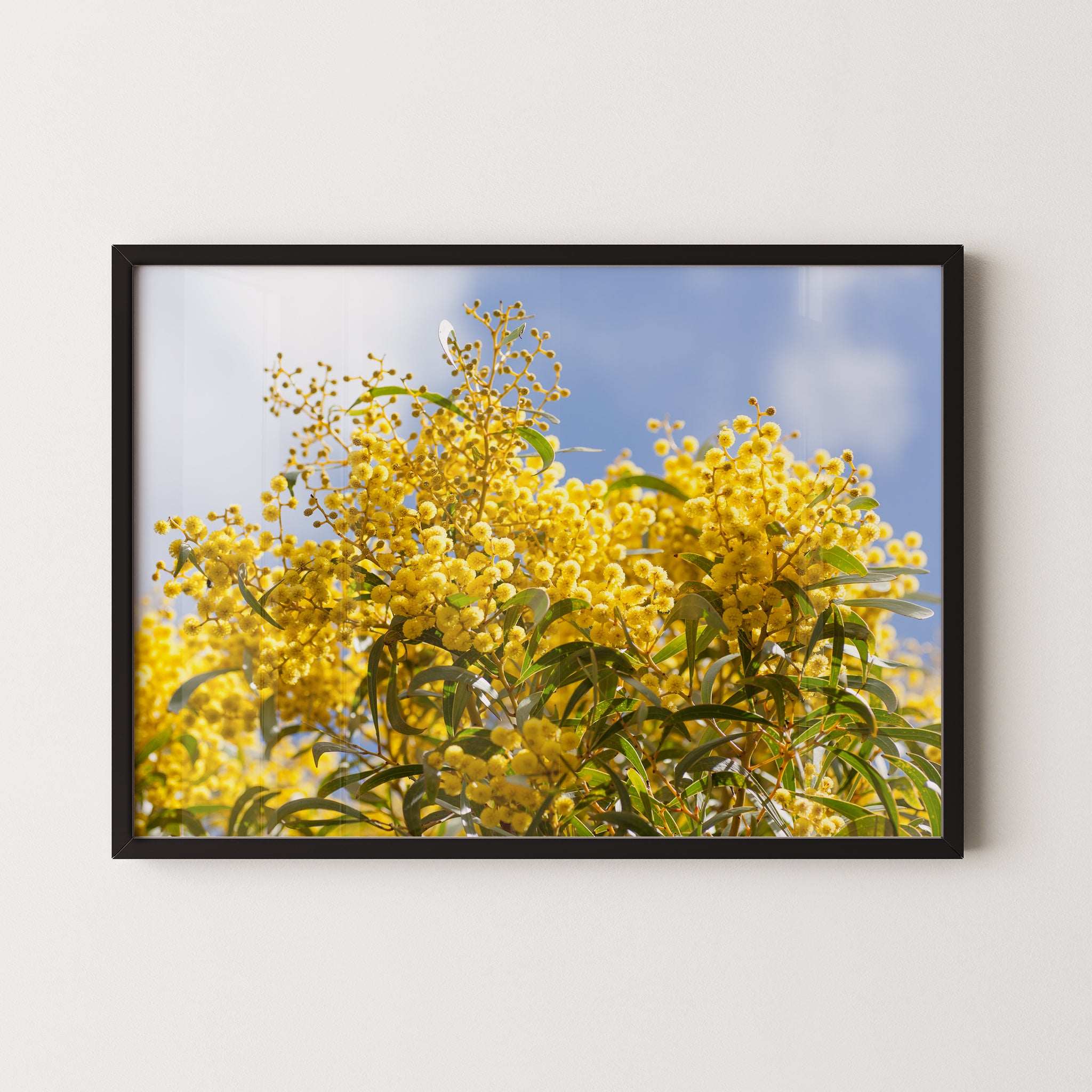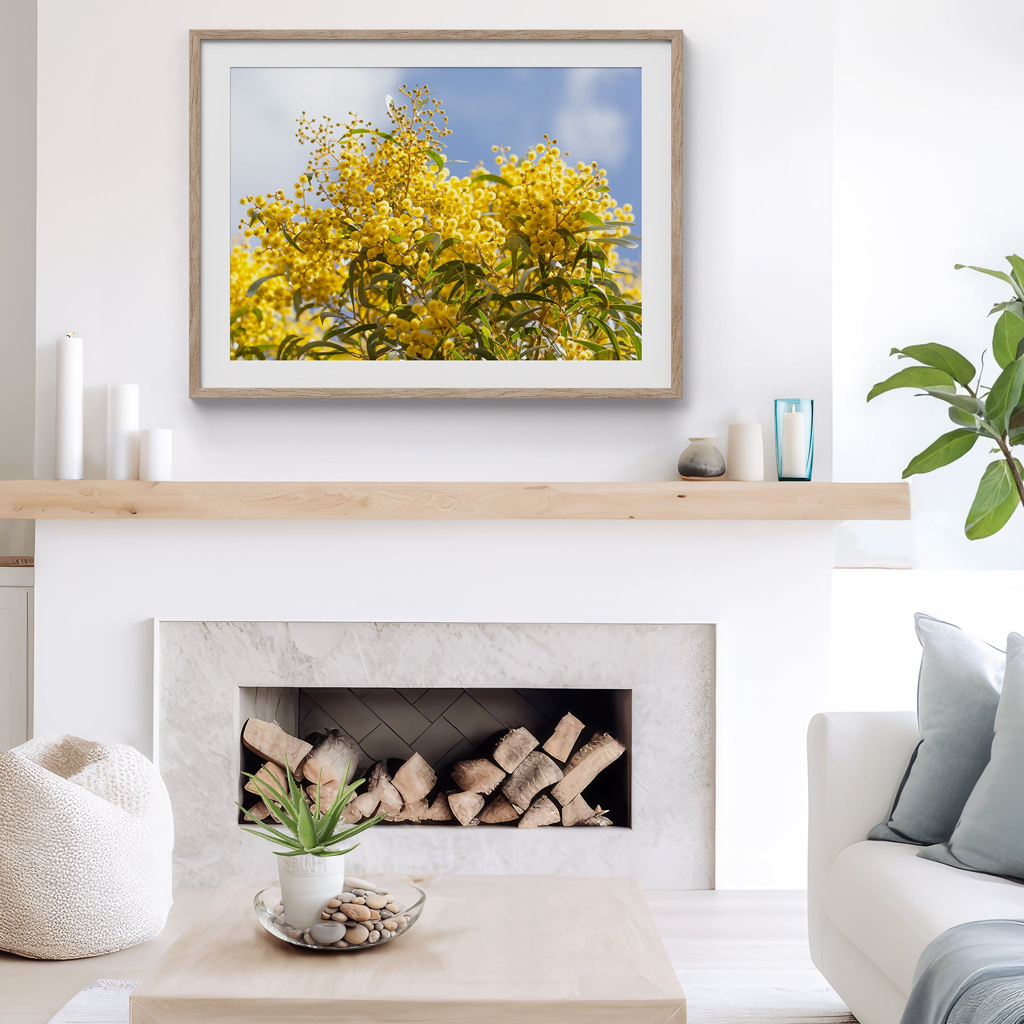 Golden Wattle, blue sky premium framed artwork by Australian Flora.