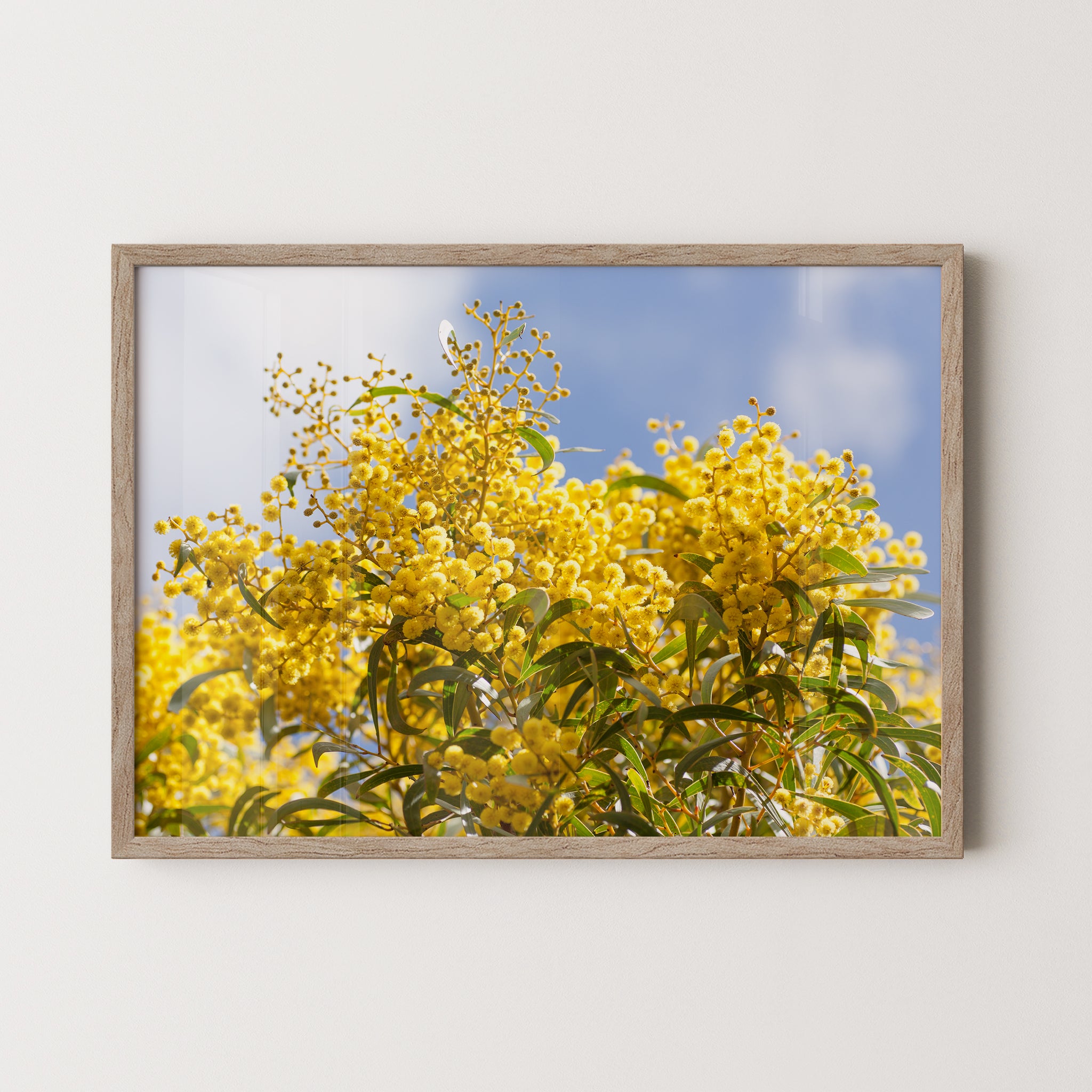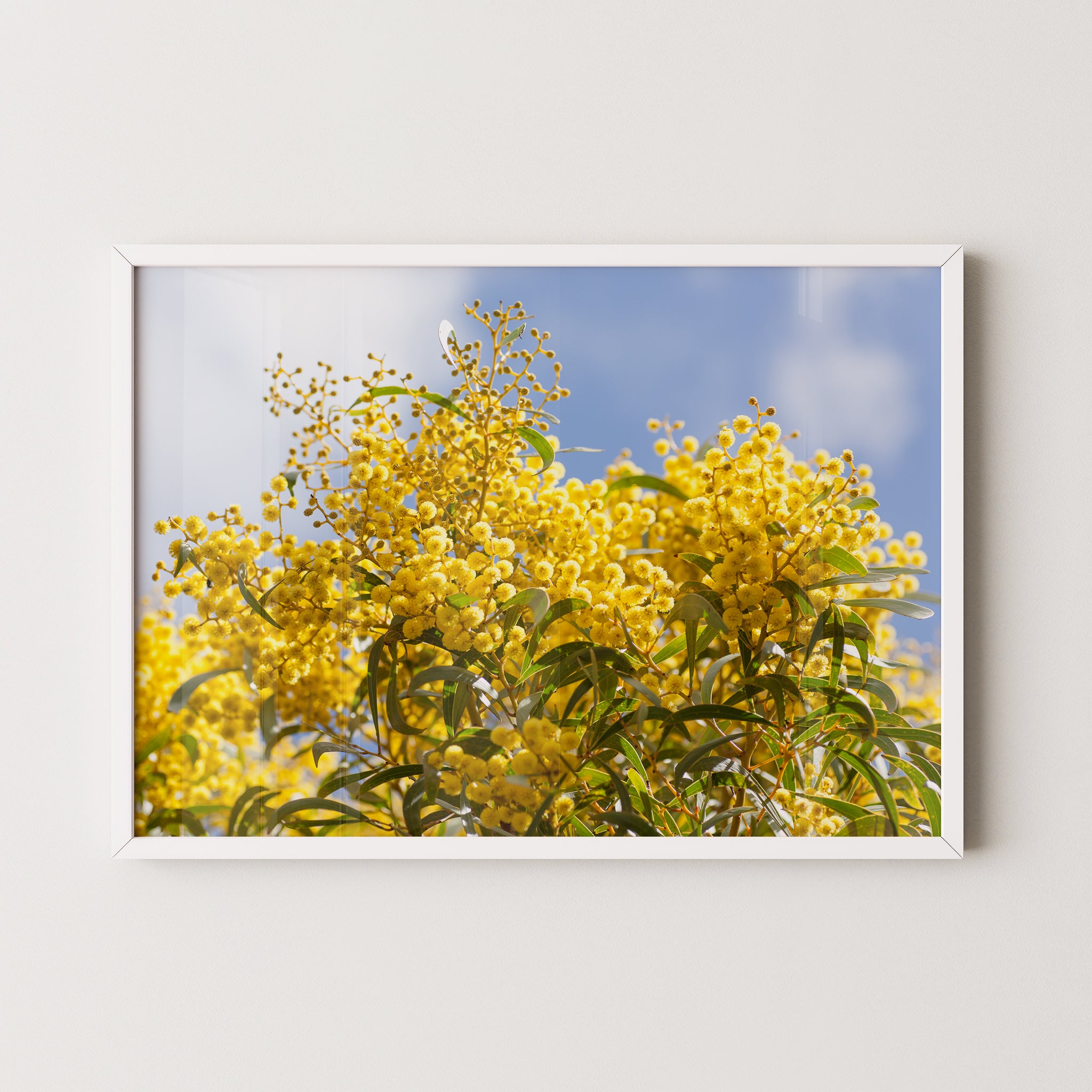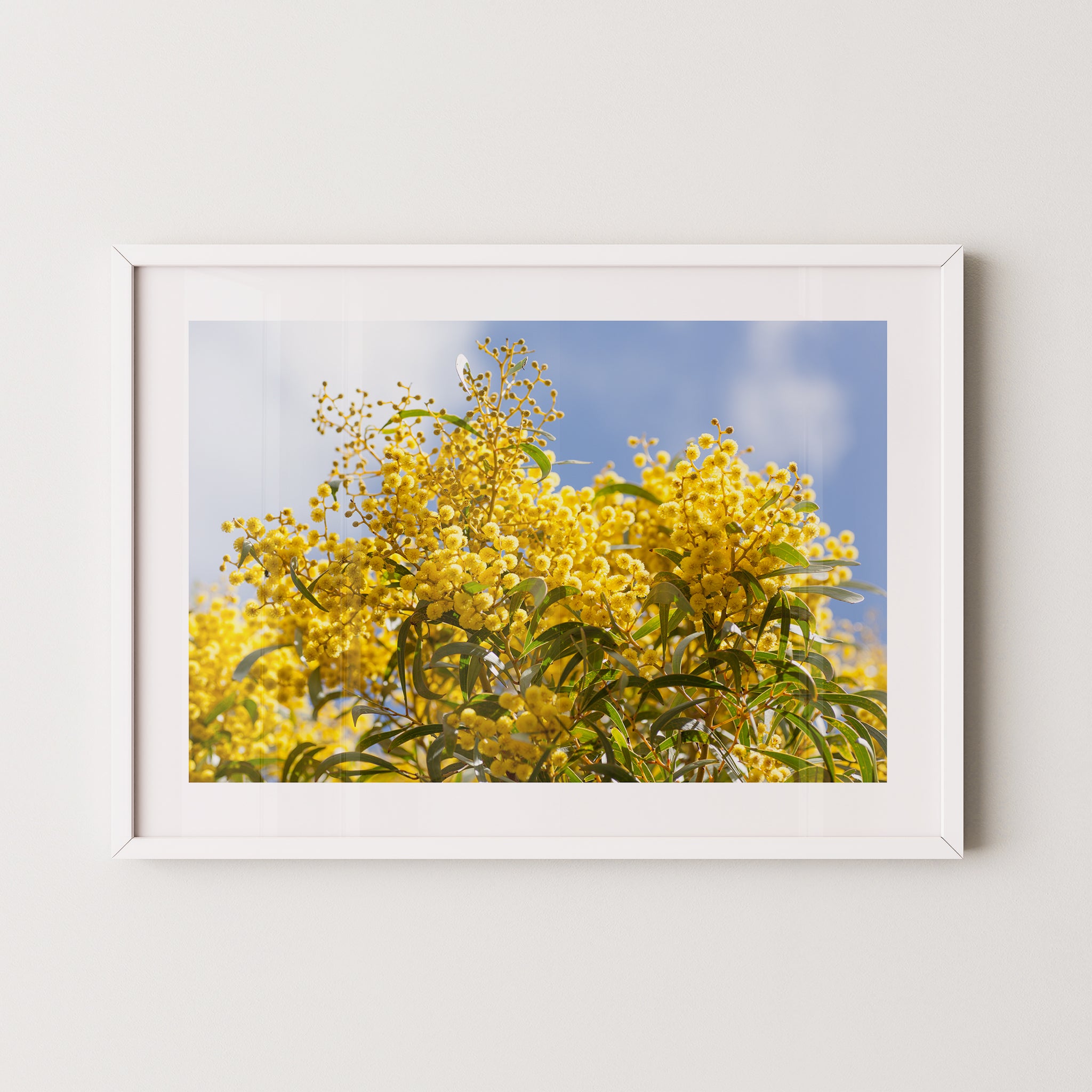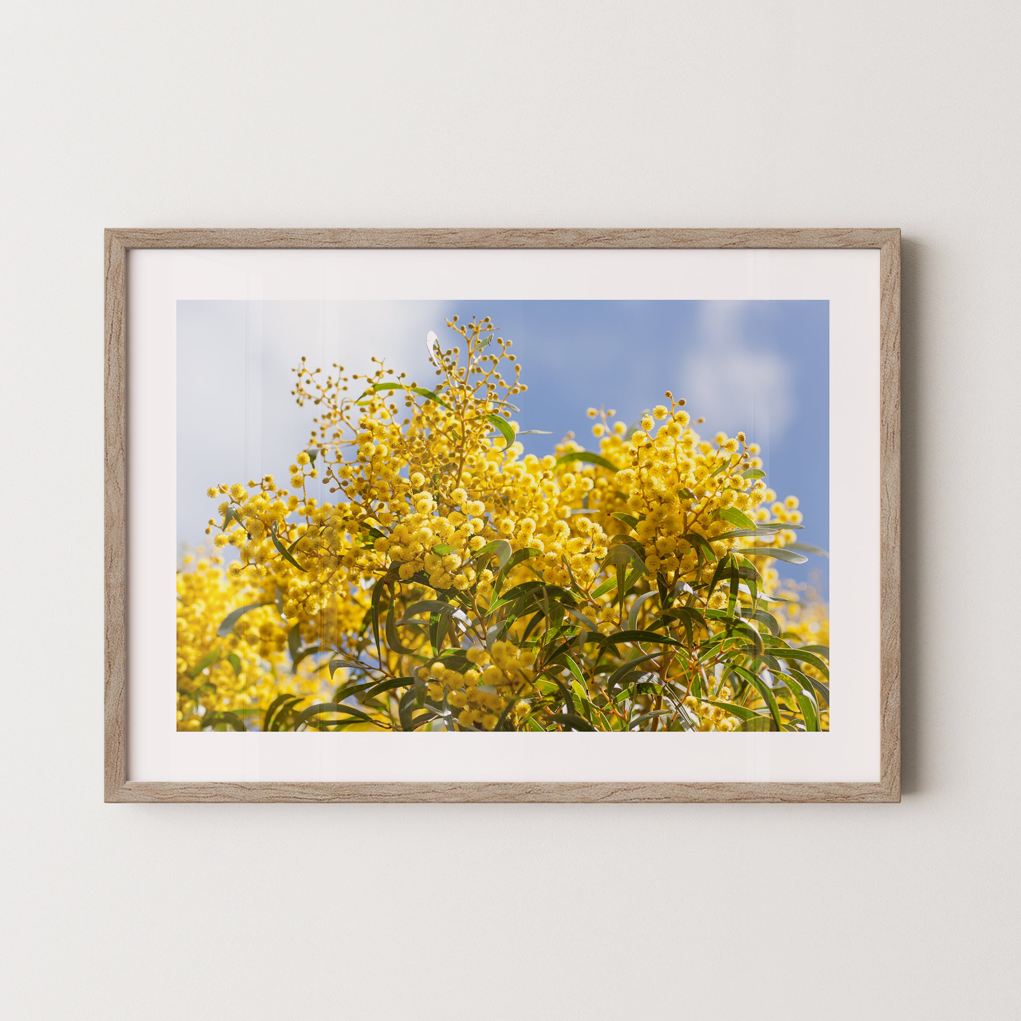 Golden Wattle, blue sky premium framed artwork by Australian Flora.