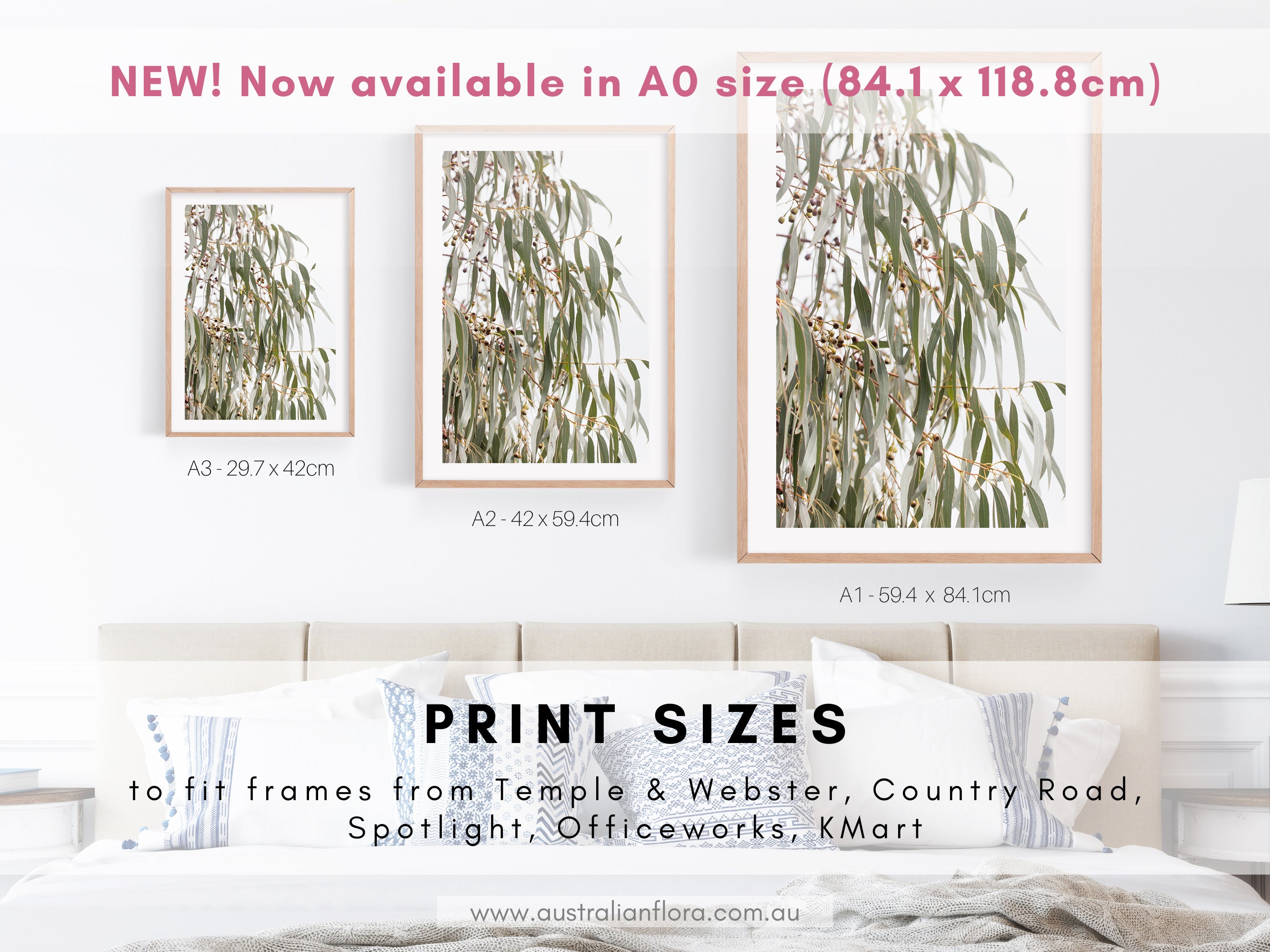 - Easy DIY framing - prints are available in a range of popular sizes to suit frames from stores including Temple and Webster, Country Road, Spotlight, Officeworks, Kmart, and more - as well as the IKEA ‘Hovsta’ and ‘Ribba' series.