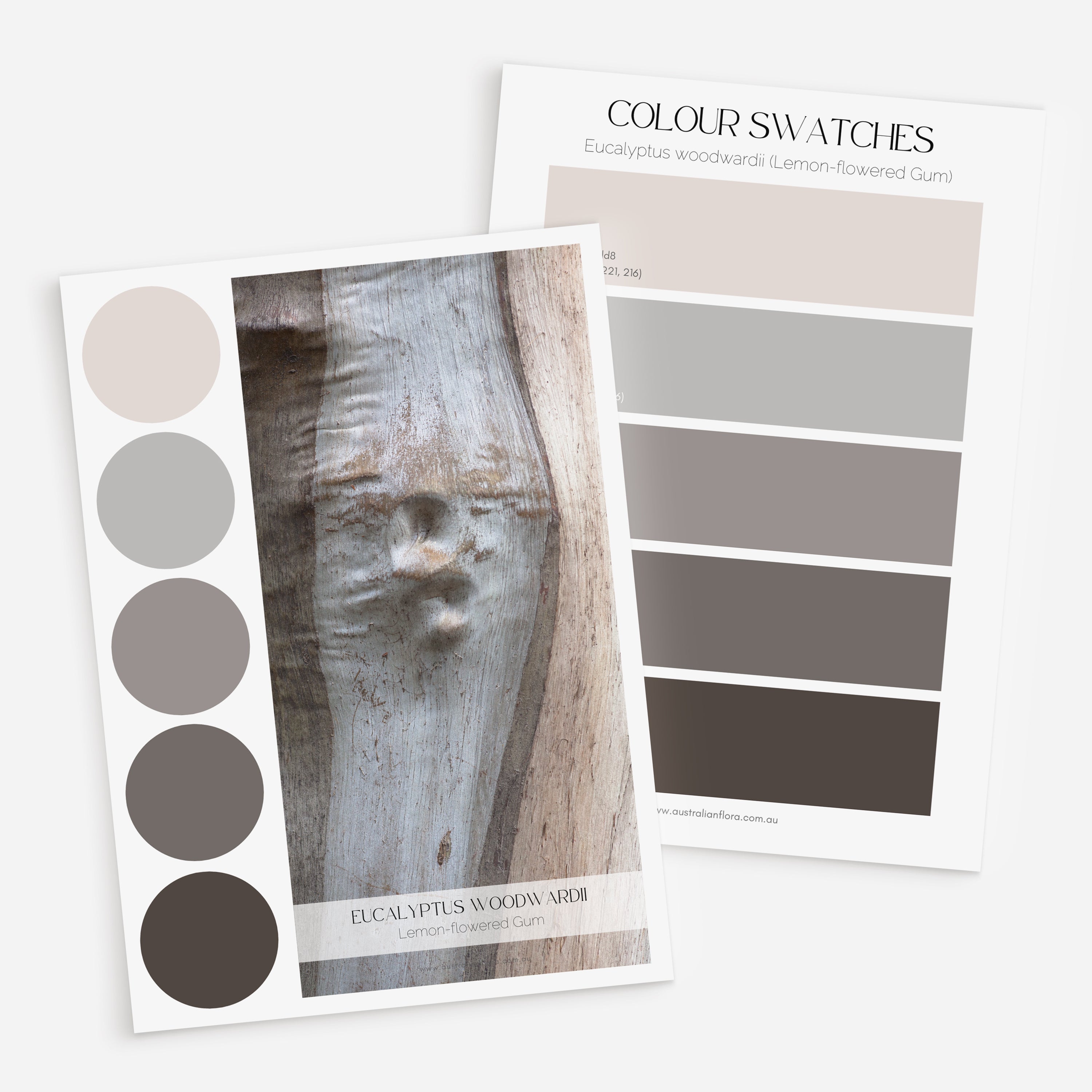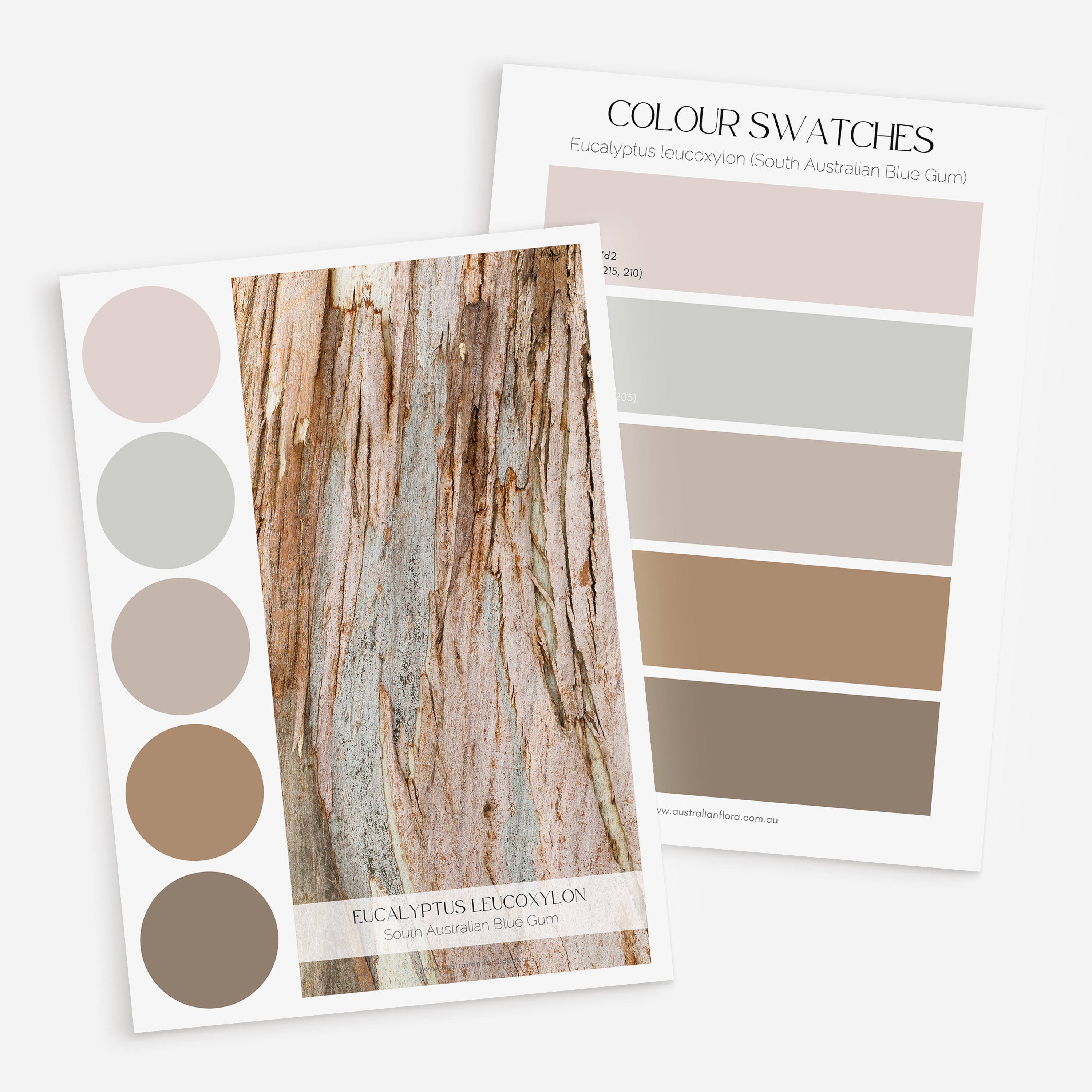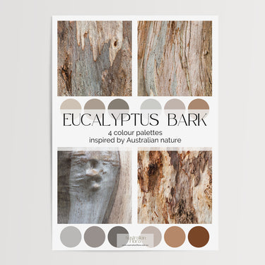 This set of 4 palettes includes 9 high quality png. files, featuring a range of neutral tones inspired by the barks of the South Australian Blue Gum (Eucalyptus Leucoxylon), the Lemon-flowered gum (Eucalyptus woodwardii) and the Sugar Gum (Eucalyptus cladocalyx).